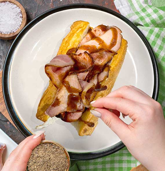 Double fried egg & bacon, hash brown on toasted French baguette with choice of sauces.